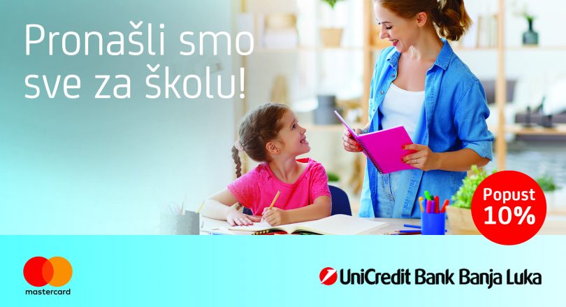 Kako bi roditeljima olakšali početak nove školske godine, u periodu od 15.08.2020. do 30.09.2020. godine, UniCredit Bank Banja Luka je pripremila poseban popust od 10% za plaćanja Mastercard karticama UniCredit Bank Banja Luka na prodajnim mjestima partnera, uključujući i njihove web trgovine. Super pogodnost koja se odnosi na neakcijski asortiman odabranih trgovaca, osiguraće ugodniju kupovinu novog školskog pribora, odjeće, obuće ili elektronske opreme za školarce.