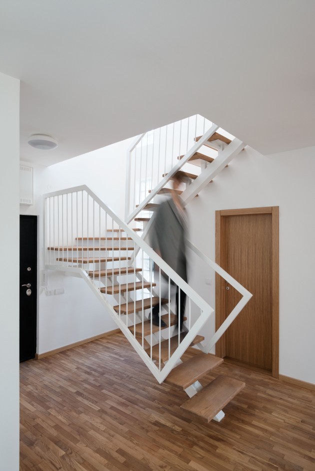Tako je projektantskim rješenjem ulaz u objekat kao i parkiranje premješteno u formalno podrumsku etažu. Zelenilo je nadomješteno parternom baštom na koju izlazi jedan od stanova u prizemlju, kao i dvjema krovnim baštama namijenjene za dva dupleksa.