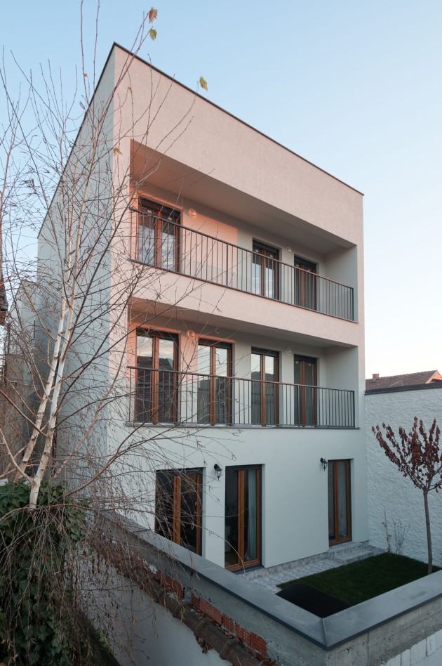Dvorišna fasada je sa druge strane tretirana tako da postaje nenametljiva u odnosu na haotičnu unutrašnjost bloka i svojim oblikom ne sugeriše višeporodično stanovanje.
