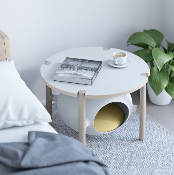 Budući da je krevet napravljen od plastike, odabran je drugi materijal koji je u kontrastu sa materijalom i oblikom, tako da ovaj namještaj mogu koristiti i mačke, ali i kao elegantan namještaj. Dakle, samo dodavanjem komada na sto, iglu lako može postati sofisticiran. Gornji dio od bijelog drveta pomaže u stvaranju veze s bijelom plastičnom kutijom ispod.