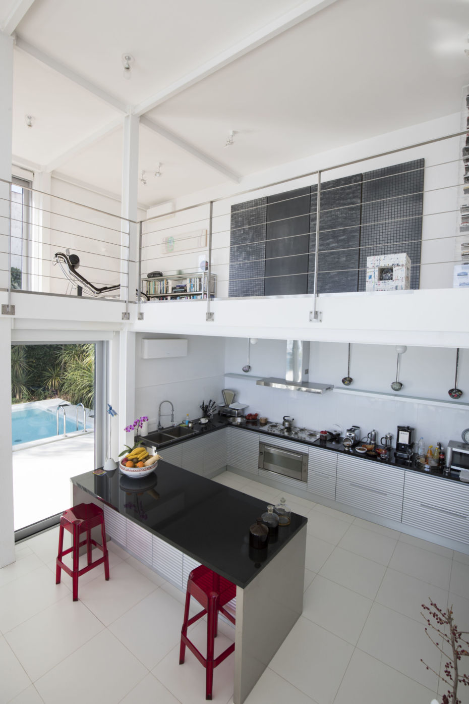 Gornji nivo na kojem je dnevni boravak prostire se na 200 kvadratnih metara, srednji je rezervisan za kuhinju, trpezariju te spavaće sobe, dok je na donjem nivou njegov atelje.