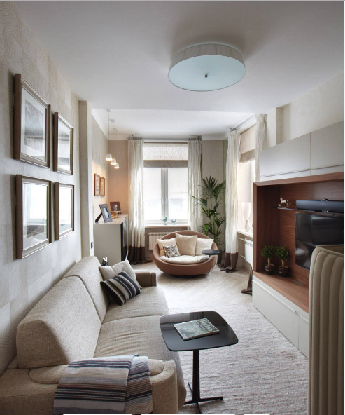 Ovdje imamo dobar primjer uređena jednog takvog stana, inače skromne kvadrature od 38 kvadrata. Za dizajn enterijera bila je zadužena arhitektica Ksenija Bobrikova koja je imala zadatak prema želji vlasnika, a to je da stan izgleda kao dobra hotelska soba.