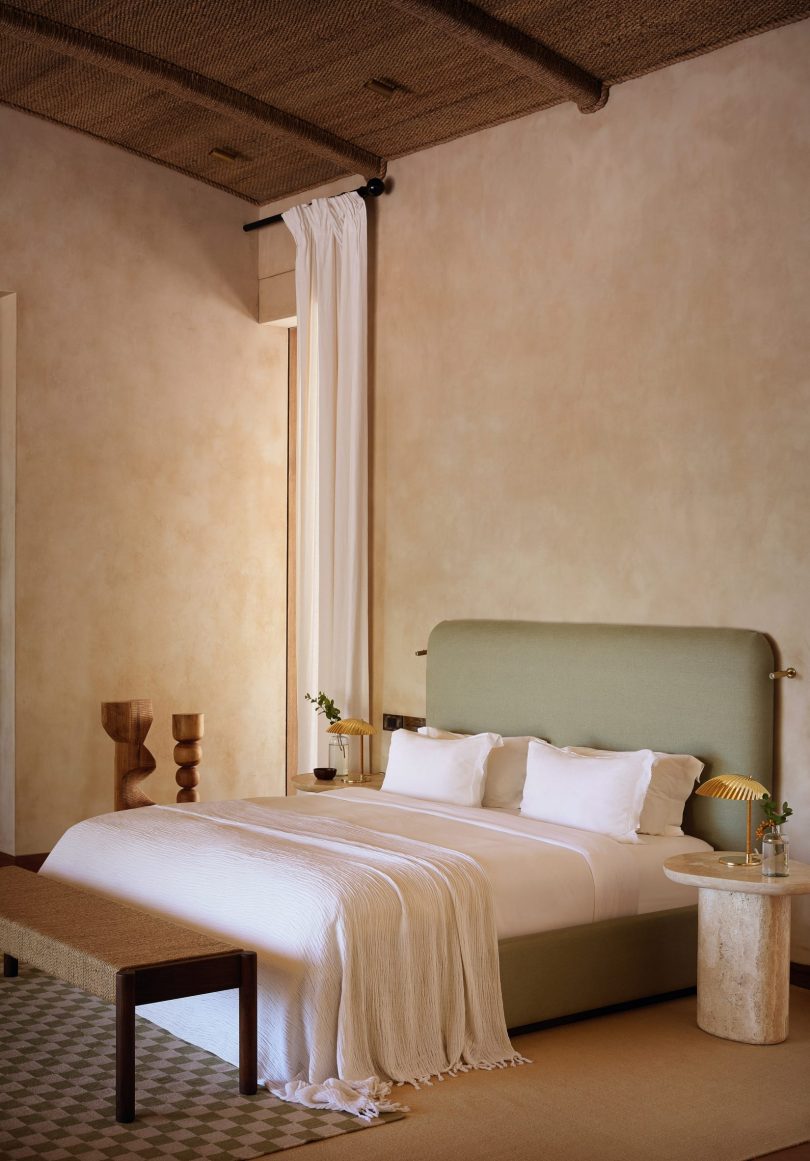Bungalovi za goste imaju oblik dugih vila i prekriveni su valovitim šarenim krovovima, koji odjekuju oblikom valova. Iznutra imaju išarane gipsane zidove i drvene podove prekrivene velikim ćilimima. Šareno štampani tekstil dodaju toplinu i raznolikost neutralnom dekoru. Ploče na vratima od tkane trave klize preko da otvore spavaće sobe i kupatila prema dnevnim boravcima i na otvorenom, omogućavajući povjetarcu da prođe. Drveni podovi obavijaju bungalove i formiraju puteve do drugih terasa koje podržavaju kabine i okružuju bazene.