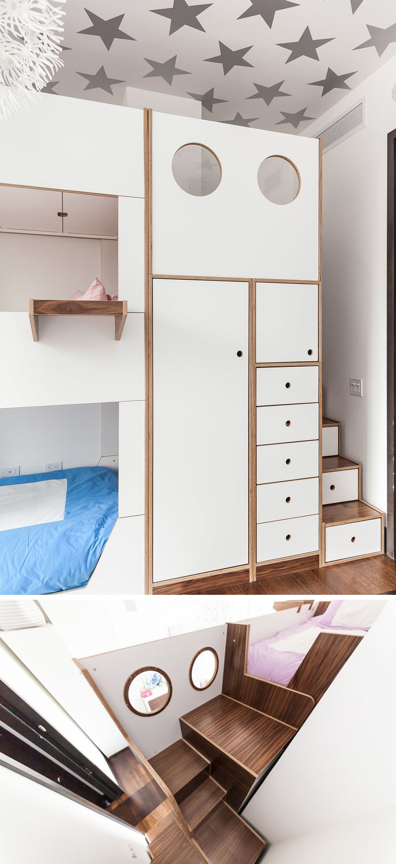 Do drugog i trećeg kreveta vode sa svake strane stepenice, u koje su ugrađene duboke ladice. Takođe, u njega je ugrađen i manji ormar. Kako bi se prostor dobio svjetla, ploča iznad ormara je djelimično izrezana, ispunjena pleksiglasom pa je tako omogućeno propuštanje dnevne svjetlost bez ugrožavanja stabilnosti konstrukcije.