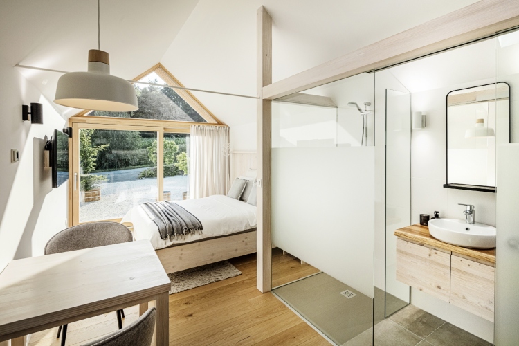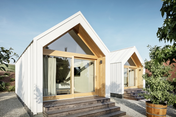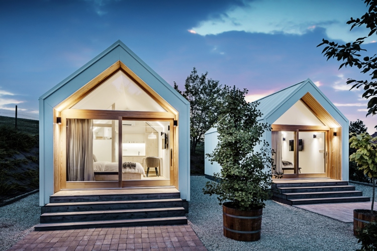 Kako je interesovanje raslo, arhitekti Maja i Goran Dominko odlučili su da gostima pruže nešto novo – moderne mini-kuće, koje su osmislili u saradnji sa MITOS GRUP, majstorima drvene montažne gradnje. Rezultat su dvije male bijele kuće od svega 21 kvadratnog metra, ali s pažljivo osmišljenim enterijerom koji izgleda kao hotelski apartman sa dušom. Prostor odiše svjetlošću zahvaljujući staklenim frontovima, a enterijer je toplog, prirodnog tona drveta sa minimalističkom kuhinjom i staklenim zidom koji diskretno odvaja elegantno kupatilo.