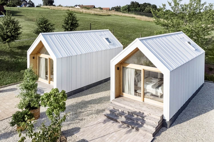 Kako je interesovanje raslo, arhitekti Maja i Goran Dominko odlučili su da gostima pruže nešto novo – moderne mini-kuće, koje su osmislili u saradnji sa MITOS GRUP, majstorima drvene montažne gradnje. Rezultat su dvije male bijele kuće od svega 21 kvadratnog metra, ali s pažljivo osmišljenim enterijerom koji izgleda kao hotelski apartman sa dušom. Prostor odiše svjetlošću zahvaljujući staklenim frontovima, a enterijer je toplog, prirodnog tona drveta sa minimalističkom kuhinjom i staklenim zidom koji diskretno odvaja elegantno kupatilo.