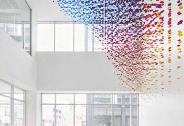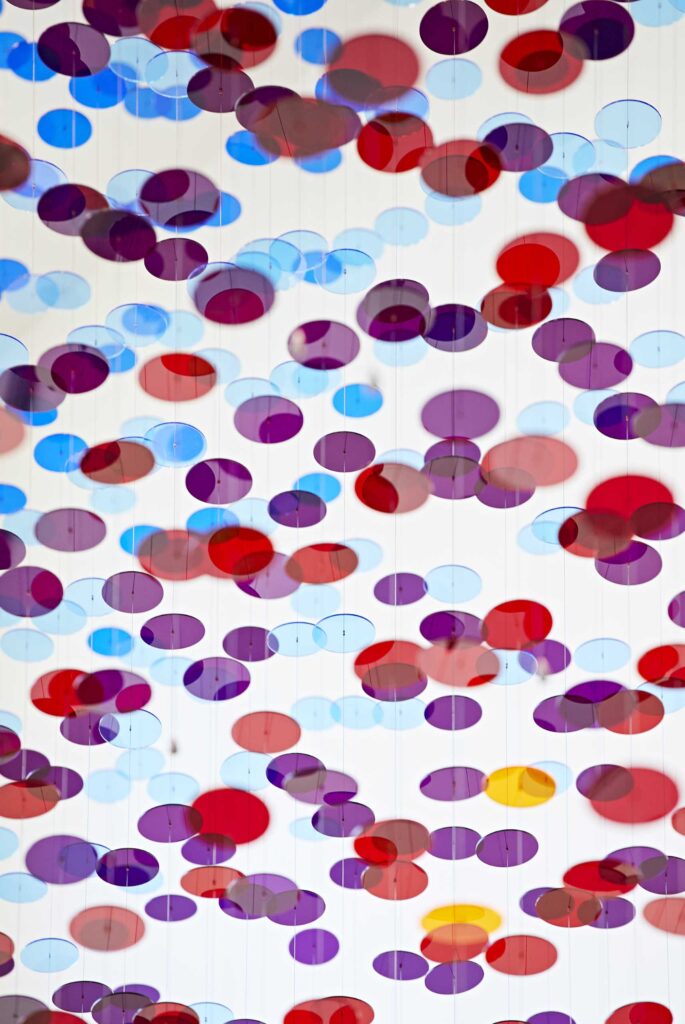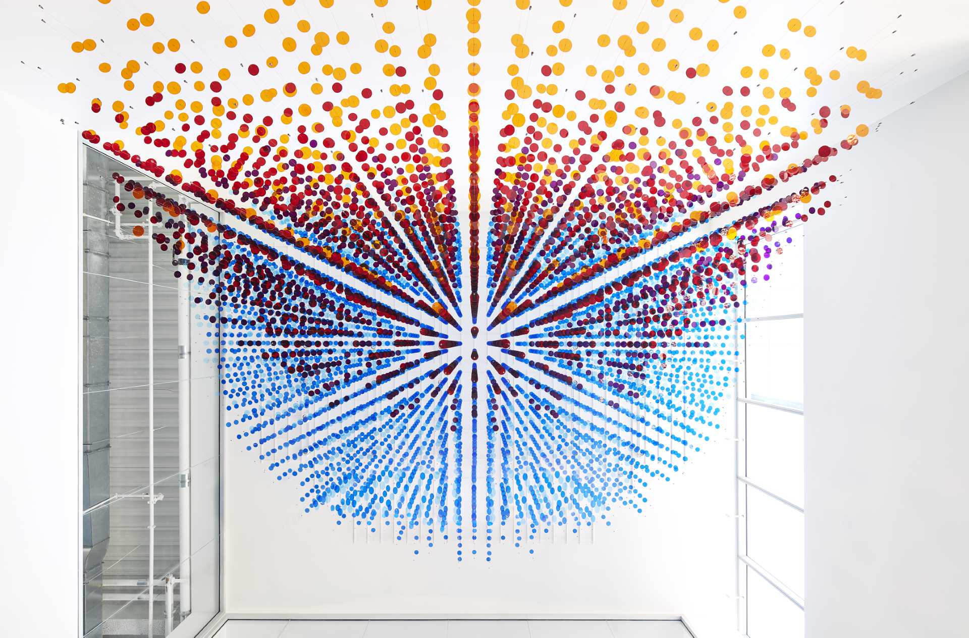 Kontrast koji stvaraju dva kraja spektra boja omekšan je gradijentom između njih: tople crvene i hladne plave boje stapaju se i rezoniraju s namještajem u predvorju, posebno odabranim da se uskladi s plavičastim tonovima instalacije. Sitni viskovi u obliku suze usidravaju naizgled plutajuće diskove, a njihova težina stvara slojeve preklapajućih pravih linija.