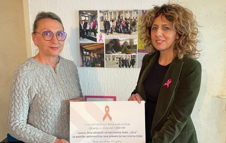 Diana Bevanda, članica Uprave zadužena za Upravljanje ljudskim potencijalima i korporativnu kulturu u UniCredit Bank Banja Luka, ovom prilikom je izjavila: “Oktobar nas podsjeća koliko je važno da svaka od nas brine o svom zdravlju, ali i da zajednica bude saveznik ženama koje se suočavaju sa ovom bolešću. UniCredit Bank Banja Luka već godinama podržava rad Saveza žena oboljelih od karcinoma dojke “Iskra”, jer vjerujemo da podrška i solidarnost mogu donijeti pozitivne promjene. Naša donacija nije samo materijalna pomoć radu Udruženja, već izraz poštovanja, empatije i zajedničke želje da svaka žena ima priliku za pravovremenu dijagnozu, kvalitetno liječenje i ozdravljenje.”